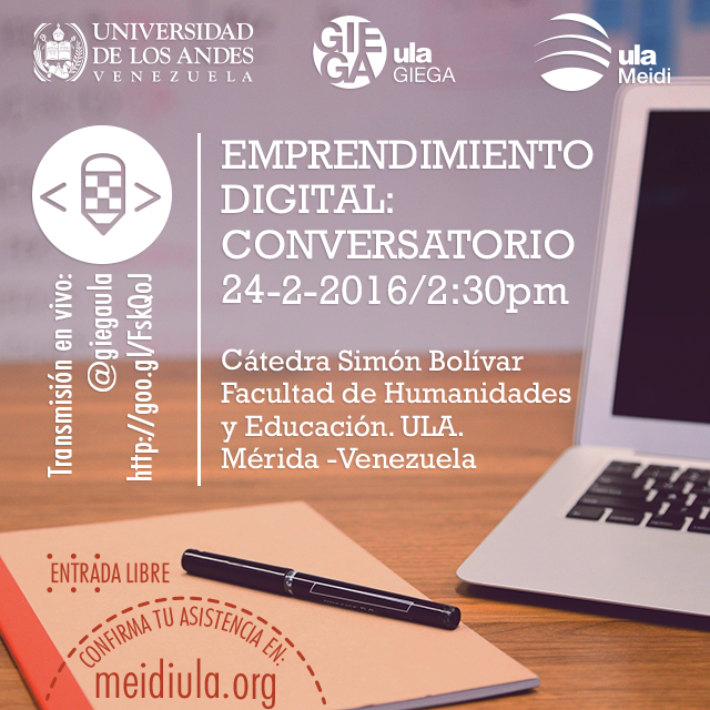 En el marco de las actividades de extensión y formación continua del MEIDI y el GIEGA de la Universidad de Los Andes, hemos organizado un conversatorio sobre Emprendimiento Digital, para compartir experiencias e inquietudes en esta materia. Este conversatorio forma parte de las actividades académicas del diplomado en Diseño Web: Estrategia y Diseño de la Información Digital.